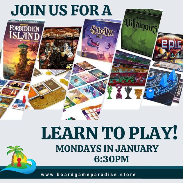 Join us every Monday to learn a new board game! Games are listed on the website Monday and are suitable for family game nights, date nights, or even if you want to come meet new friends to learn and play with!