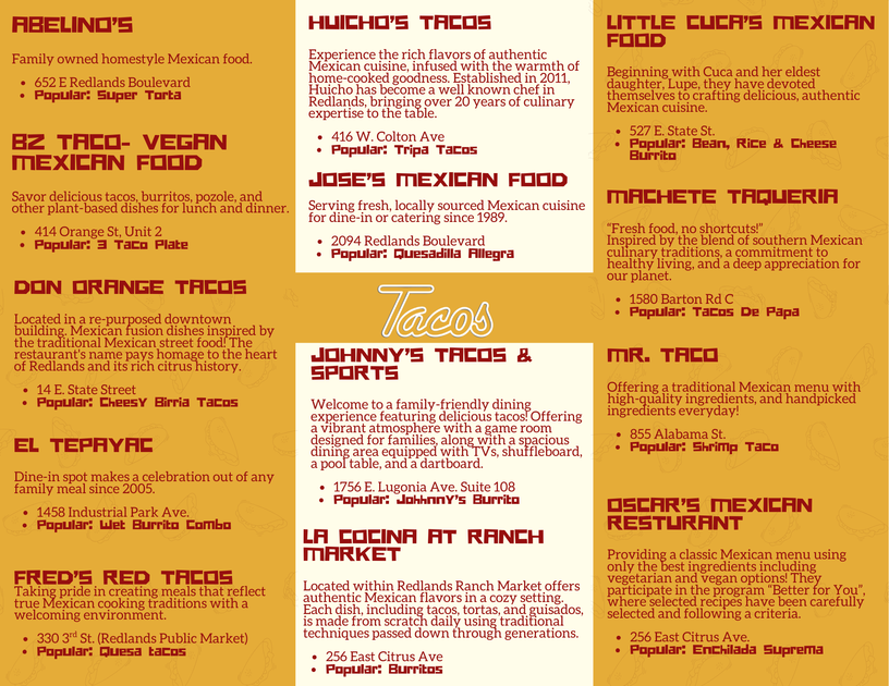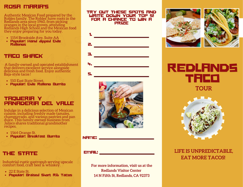 Stop by the Redlands Visitor Center for REDLANDS TACO TOUR brochure pictured. Hours on Google.