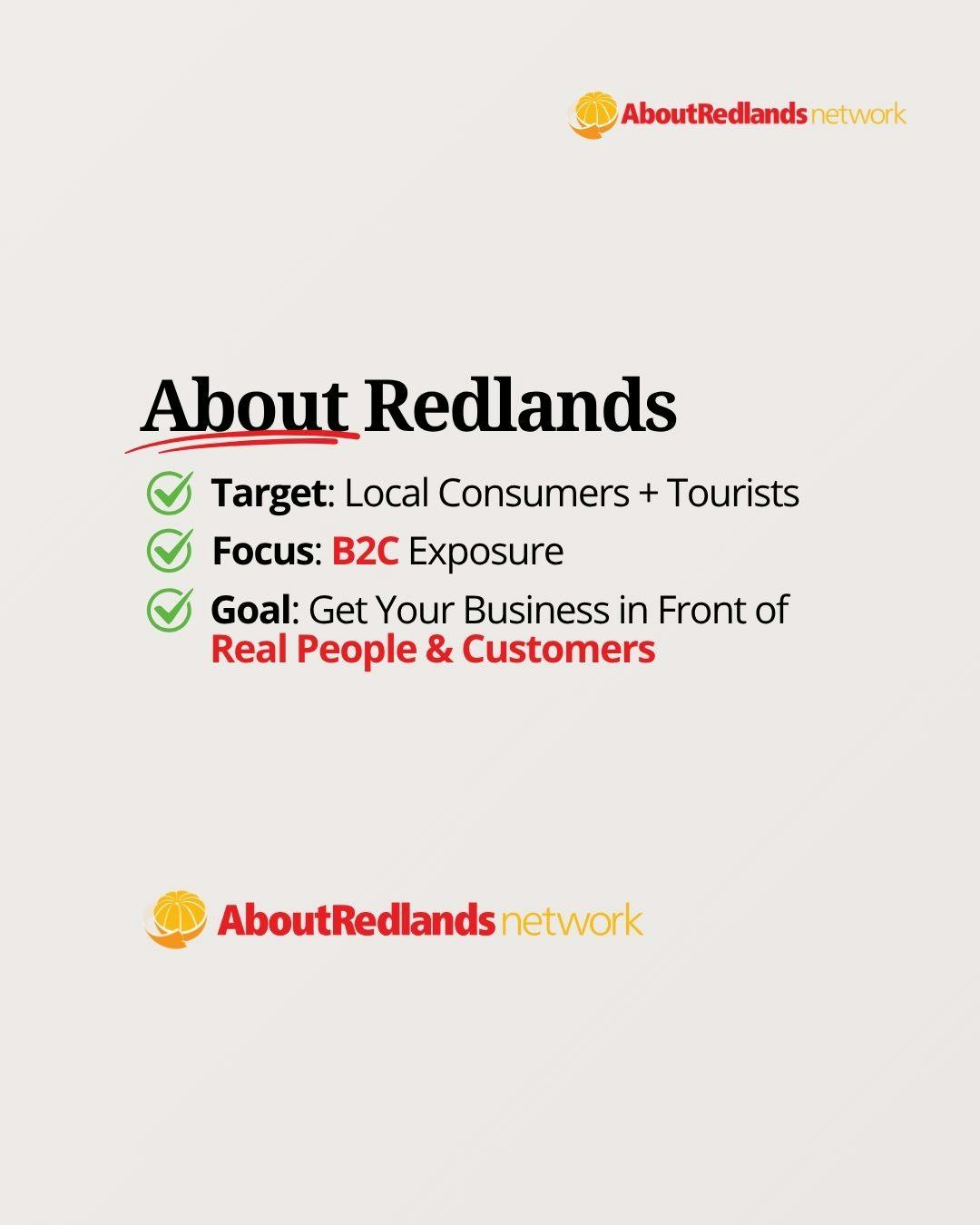 - Local residents, tourists, and consumers looking for services, events, and businesses in Redlands.