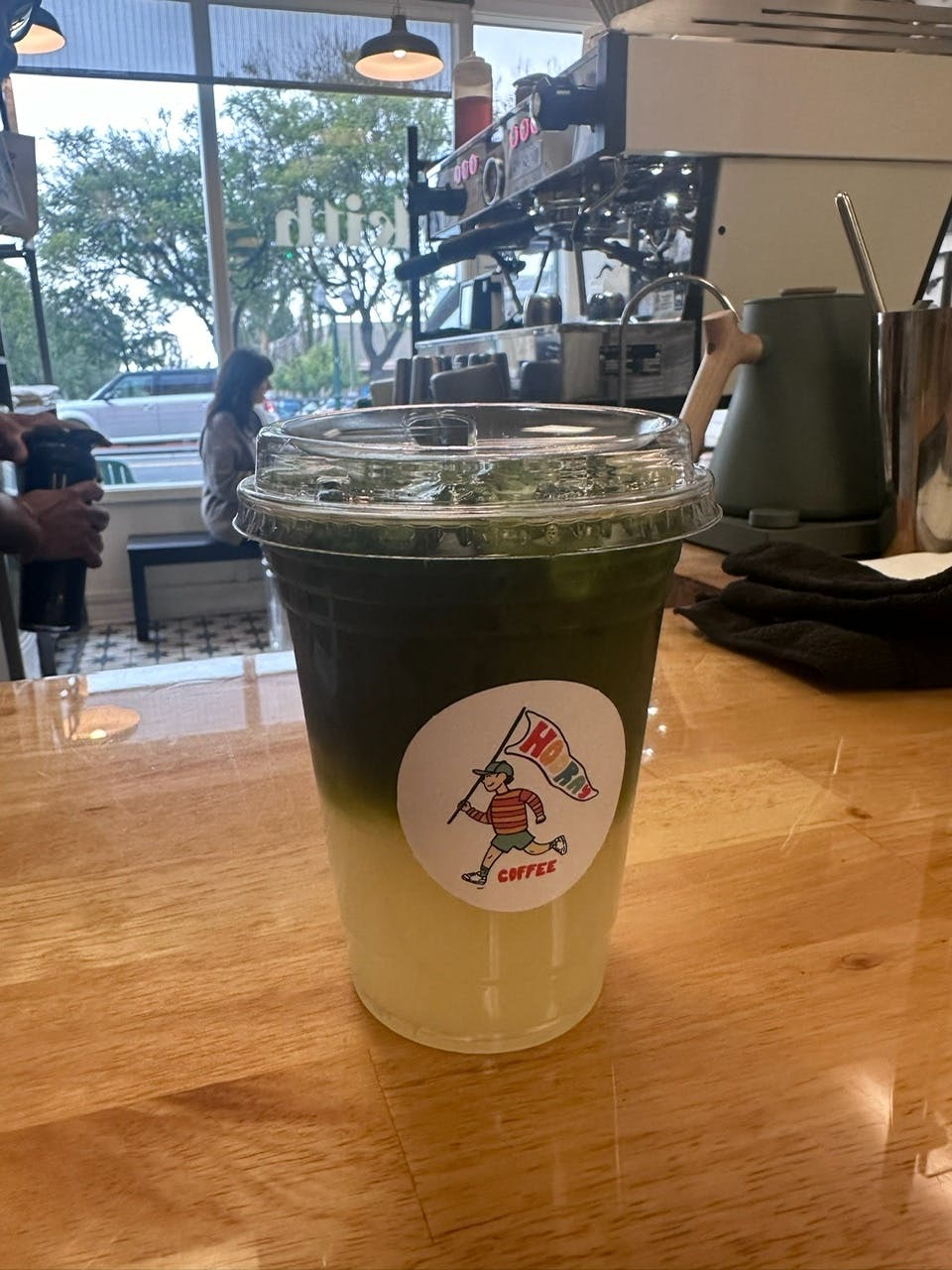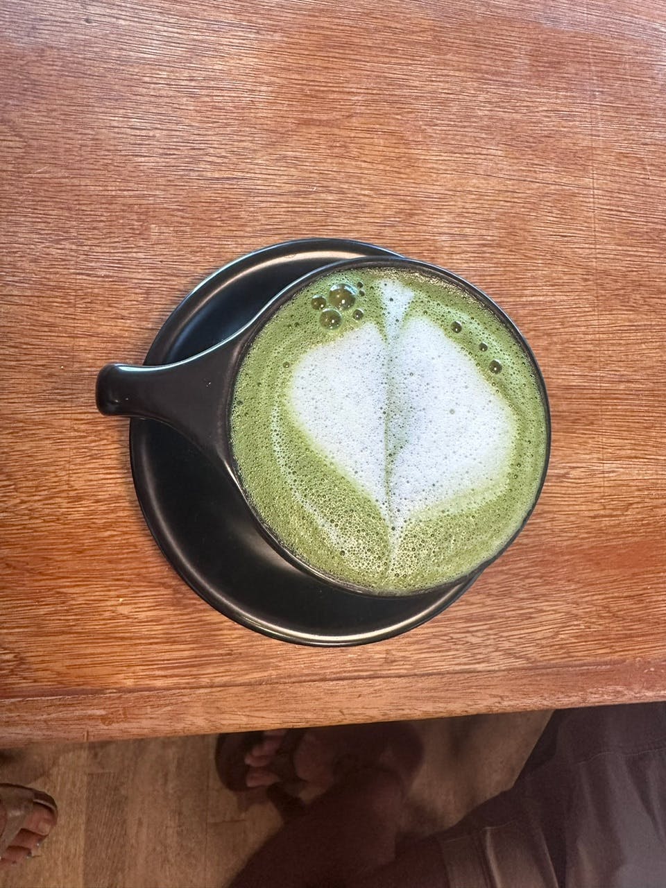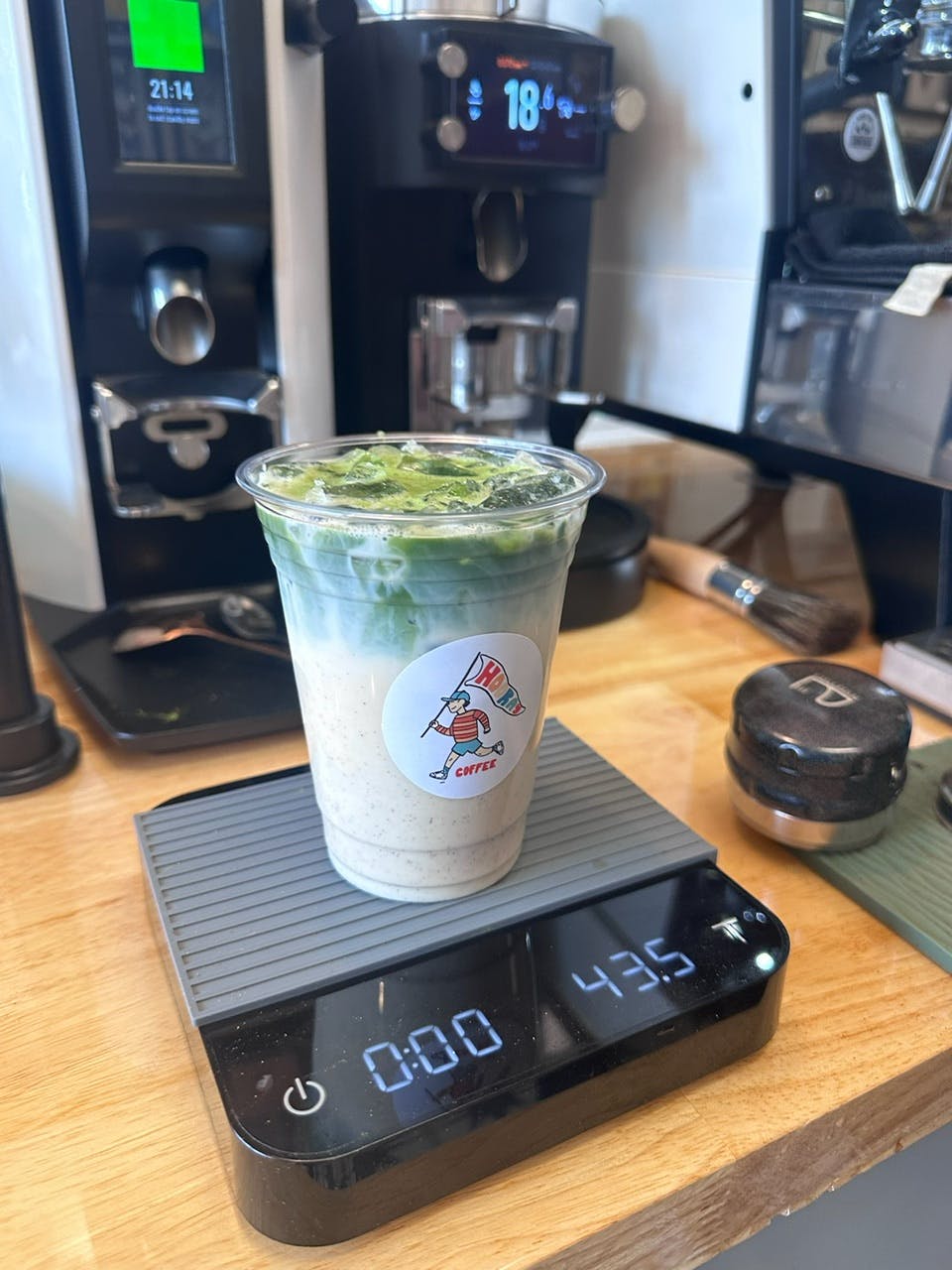Our Order: Iced Midnight Matcha, and a classic pour-over with beans called Daniel Munos and washed with Colombian gesha.