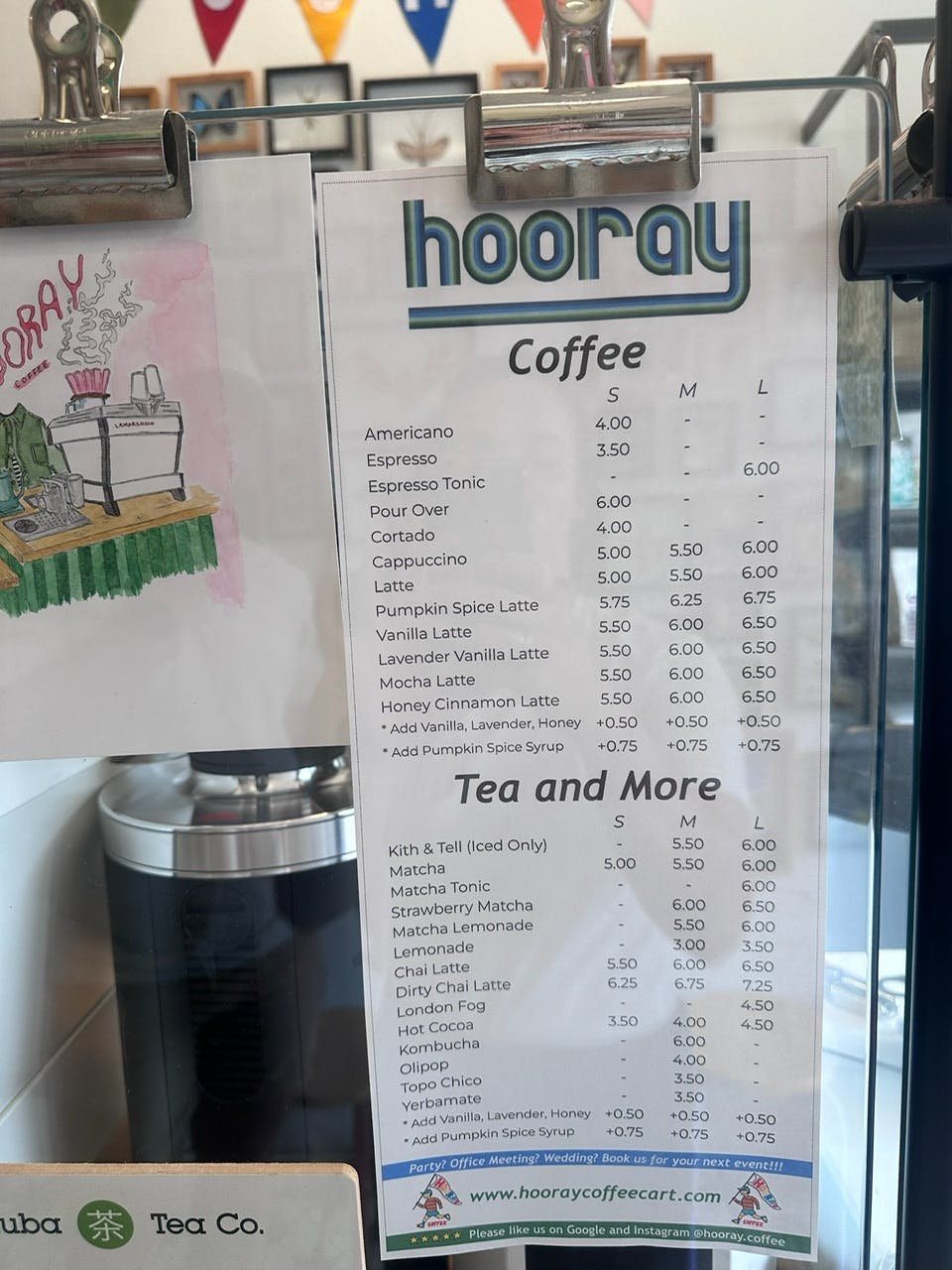 Hooray Coffee is a coffee cart business that opened in December of 2023 in the popular downtown shop Kith & Kissui. Nick, the Host/Manager/Barista/Creative Director, was working in Orange County with a coffee importer and wanted to bring his 8-year coffee love affair and experience closer to home.
