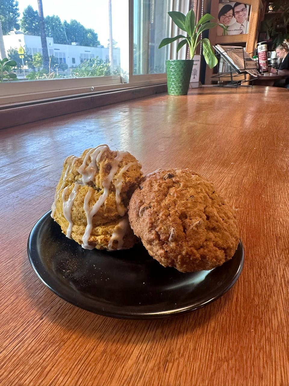 Order: Fresh off their fall menu, “A Bushel of Chai” is a dirty chai latte with apple syrup, caramel, and nutmeg. We also had the “Fall Into Matcha,” a traditional matcha latte with raspberry and vanilla. We rounded out our order with a seasonal pumpkin scone and a pumpkin cookie.