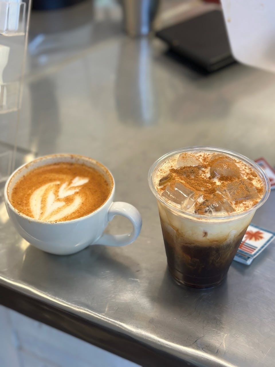 Our Order: Pumpkin Chai Latte with cold foam and Jasmine Tea Latte with lavender syrup.