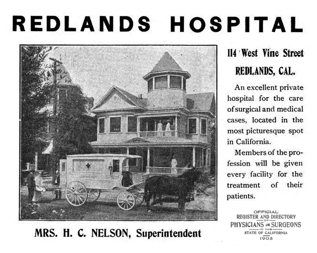 Originally Redlands Community Hospital in 1903-1904, now a medical office for Mission Pediatrics. In 1903 a group of Redlands physicians remodeled this home at 114 W Vine Street and converted it into a temporary clinic hospital.