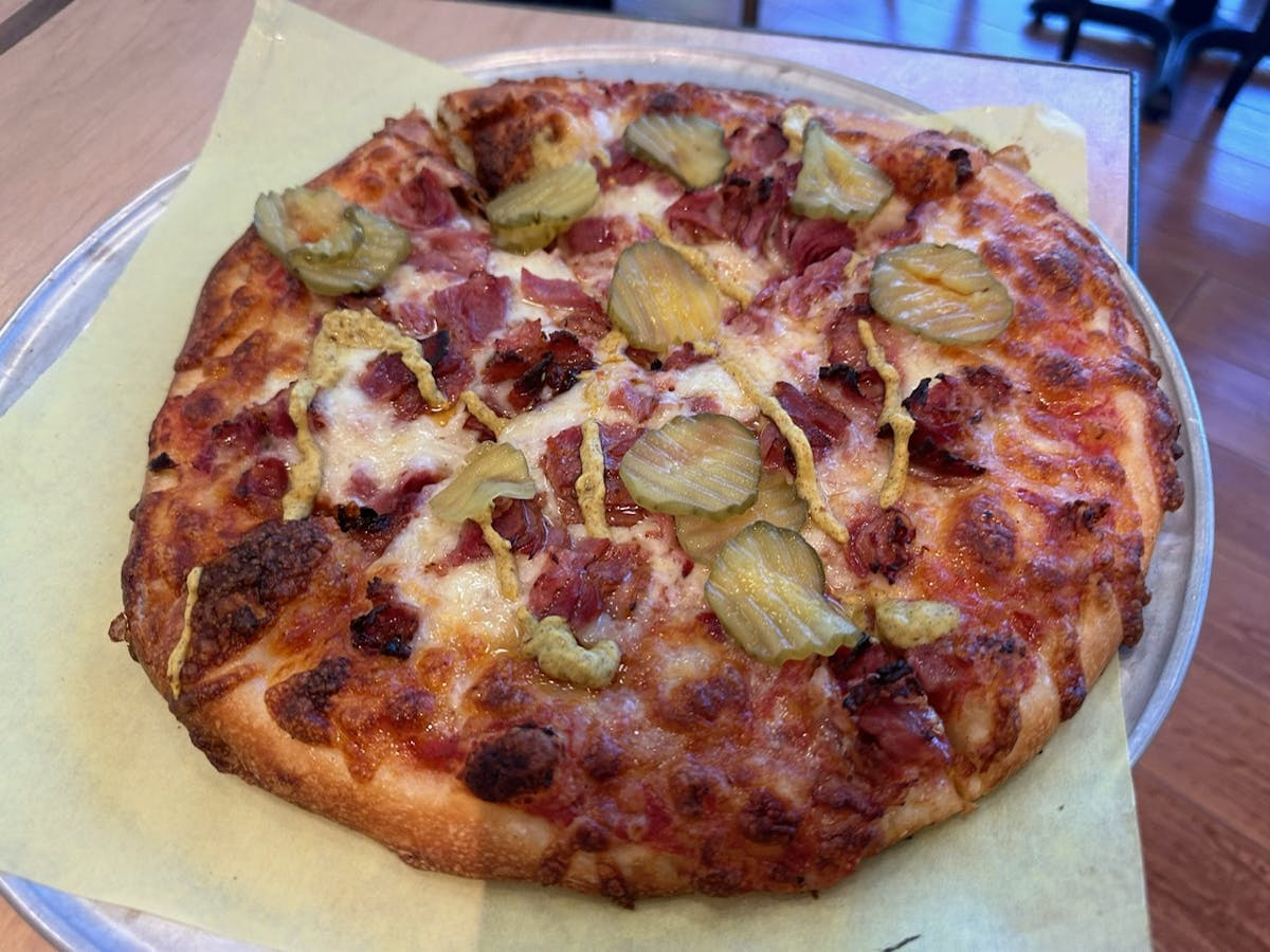 - Pastrami Pizza had a base of a classic red sauce, mozzarella cheese, pastrami, spicy mustard, and pickles! This pizza was so good. As a pickle lover, I have never considered putting them on a pizza, but now I think I have a new favorite.