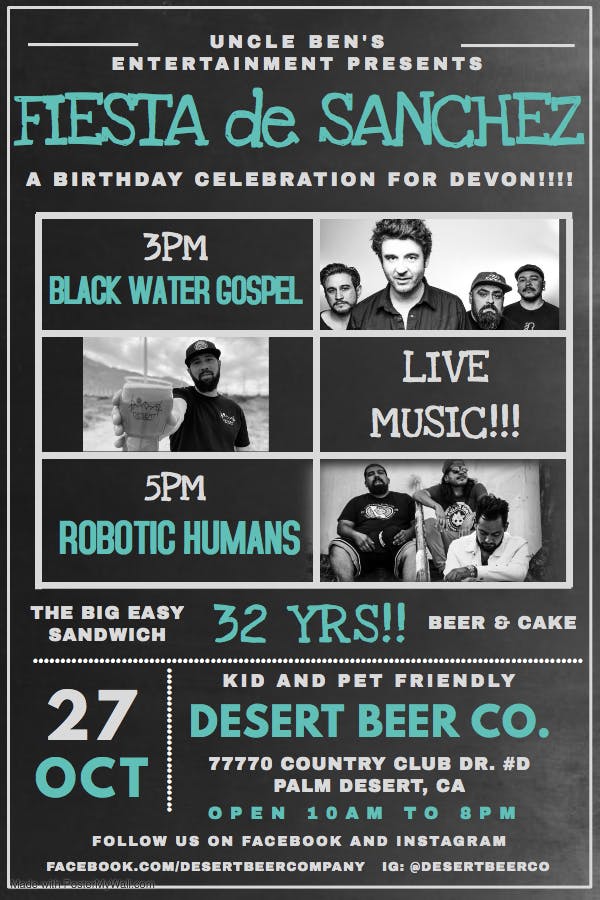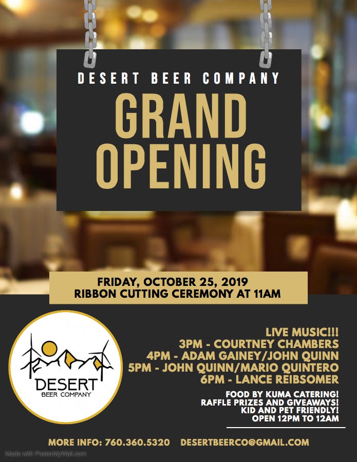 Desert Beer Co. is celebrating their GRAND OPENING October 25th! Ribbon cutting ceremony at 11AM. There will be live music by multiple artists (details in flyer below), food by Kuma Catering, raffle prizes, giveaways, kid and pet friendly. Open 12PM-12AM.