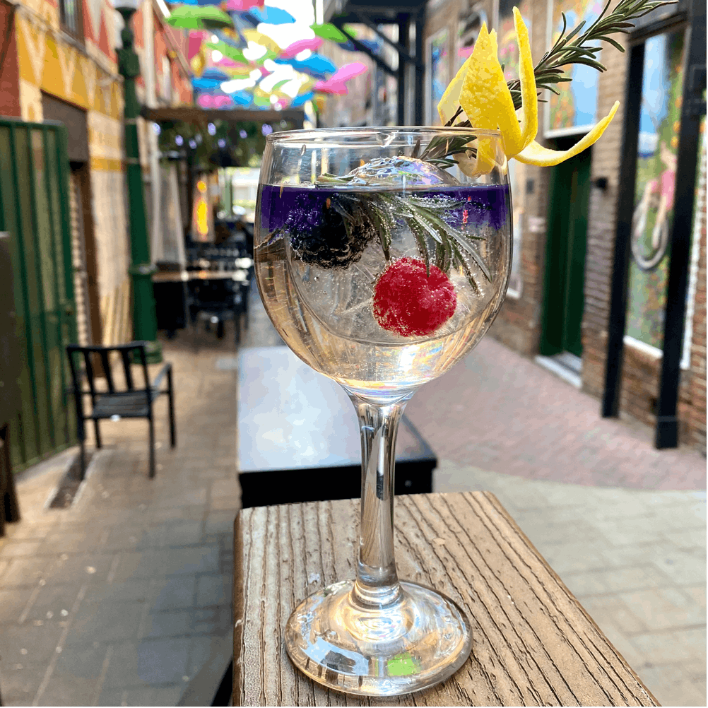 Gin Solstice (picture 1): This floral, gin-based signature cocktail will have you mesmerized. The floated layer of butterfly pea gin almost distracts you from the sphere ice cube with berries and rosemary frozen inside. This cocktail’s sweetness from the simple syrup and the acidity from the lime juice both complement the floral notes from the gin.