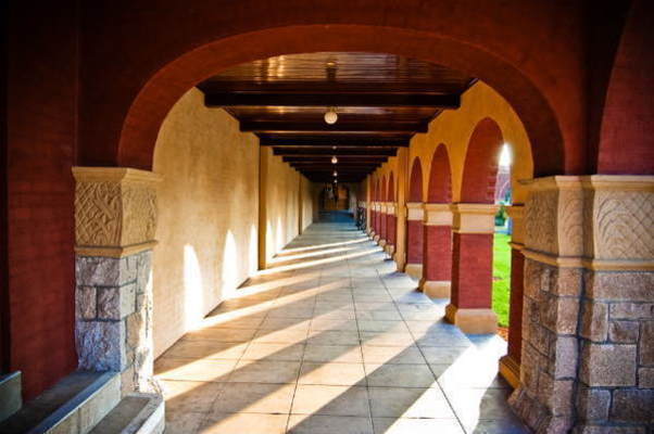 The University of Redlands campus features a palm-lined main street, lush green lawns, and canopy of 100-year-old trees.