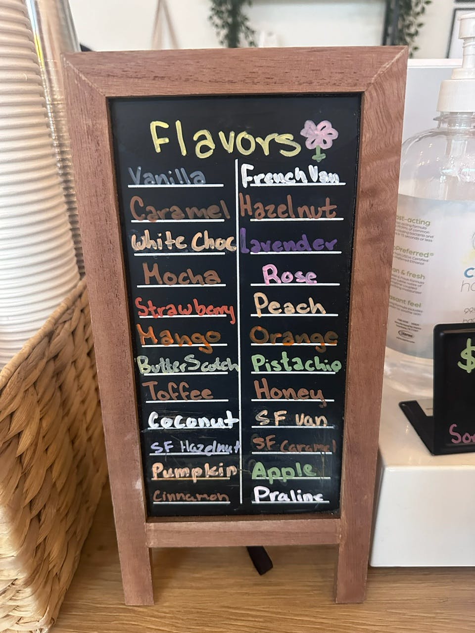 The menu is full of different drink variations, both classic and unique. It covers a huge chalkboard wall with cute depictions of what each drink is and has in it. They also have select pastries daily and sandwiches on the weekend. On Fridays, they have personalized charcuterie boards for sale.